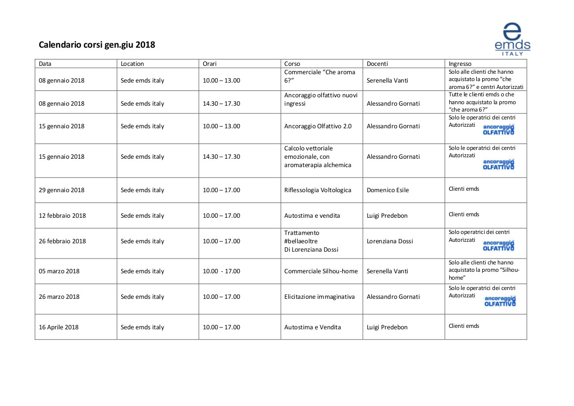 Ai corsi, come sempre saranno ammesse le clienti emds italy; vengono però istituiti corsi e percorsi formativi dedicati alle clienti che hanno scelto di caratterizzarsi attraverso un’impronta profondamente olistica. Nascono i centri estetici Olistici Specializzati e i centri estetici Autorizzati all’uso ed alla diffusione comunicativa dell’ancoraggio olfattivo.